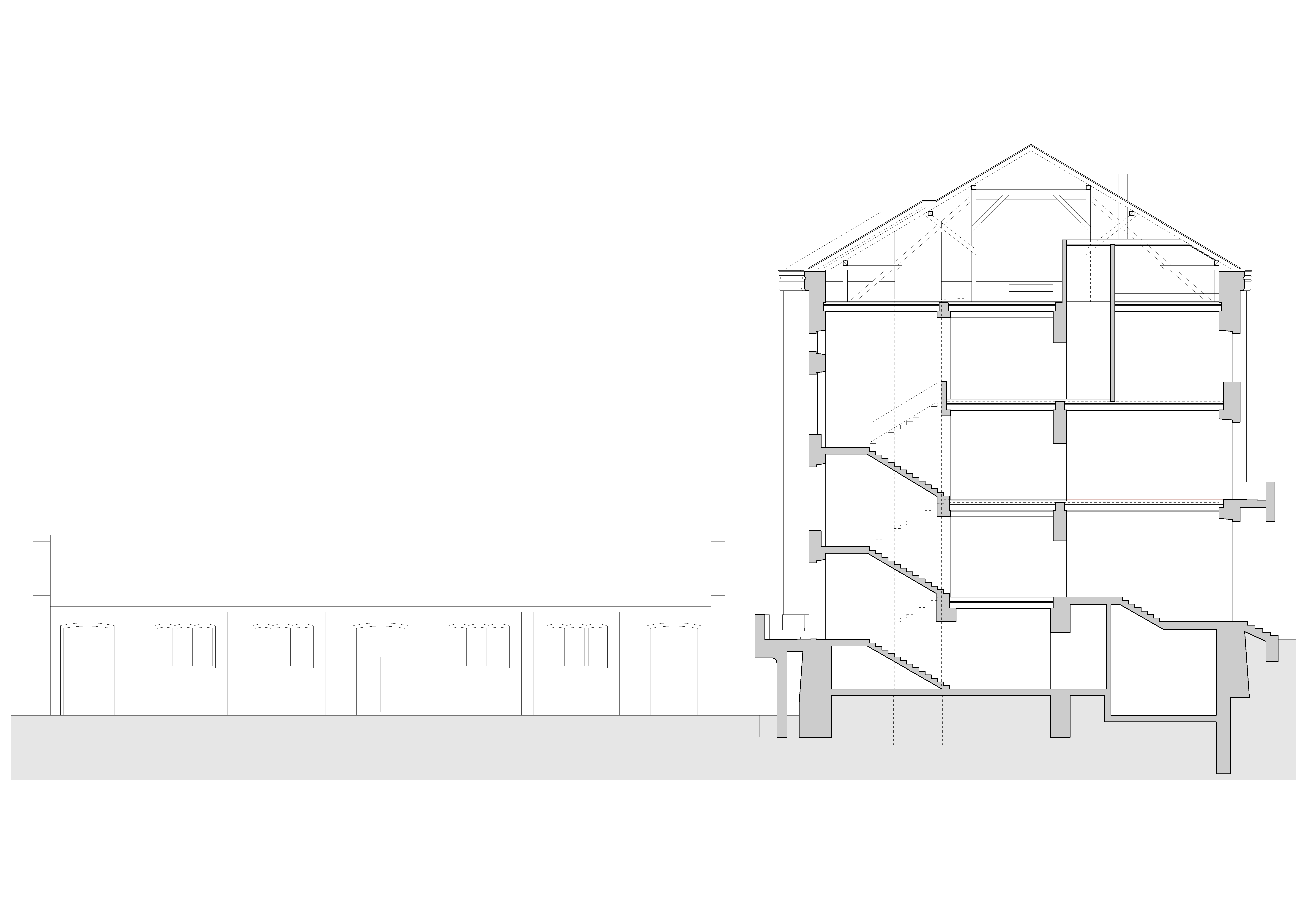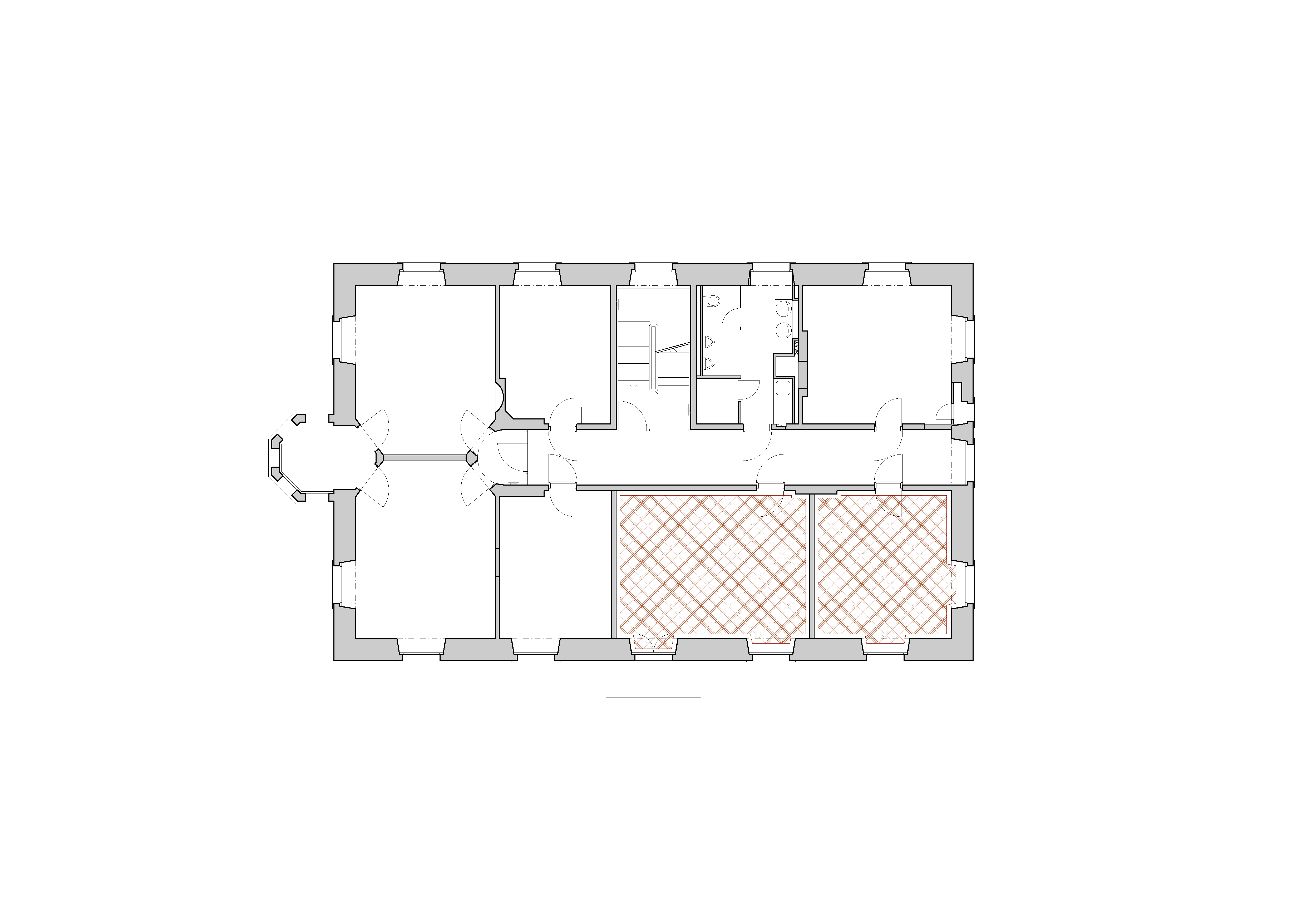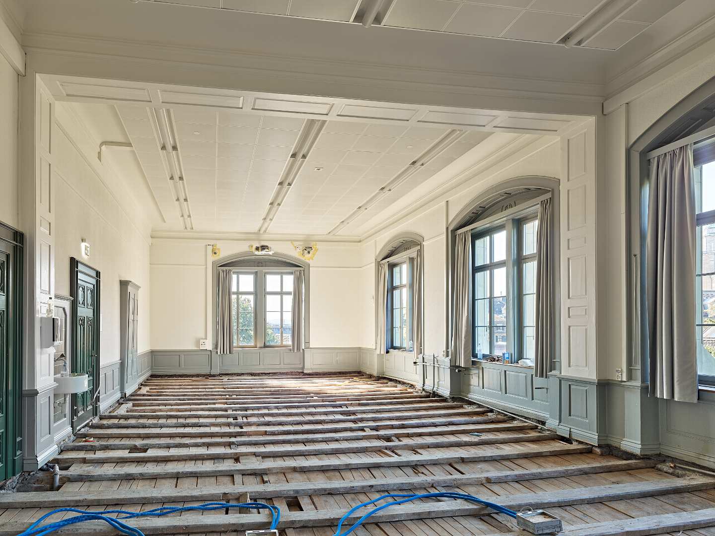 Schwerpunkt des baulichen Eingriffs lag bei der Behebung des Problems schräger Böden mit einer Höhendifferenz > 6 cm, das aus arbeitsmedizinischer Sicht für die Nutzer:innen bedenklich sein kann. In enger Absprache und mit dokumentarischer Begleitung der Denkmalpflege wurde ein Rückbau bis zum bestehenden Blindboden vorgenommen, die Höhendifferenzen nivelliert und der Wiederaufbau des Bodens mit ergänzter Dämmung vorgenommen. Zudem wurden durch den neuen Verbund die Schwingungen eingeschränkt und die Balken statisch verstärkt. Der Wiederaufbau des Bodens und die Fischgratverlegung folgten dem ursprünglichen Erscheinungsbild der Räume, wobei anstelle des Buchenparketts das bauzeitliche Eichenparkett verlegt wurde. Die Sanierungen erfolgten etappenweise und unter laufendem Betrieb.