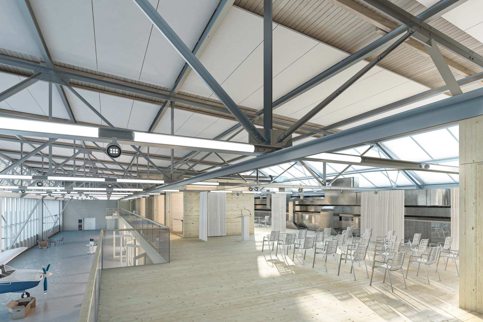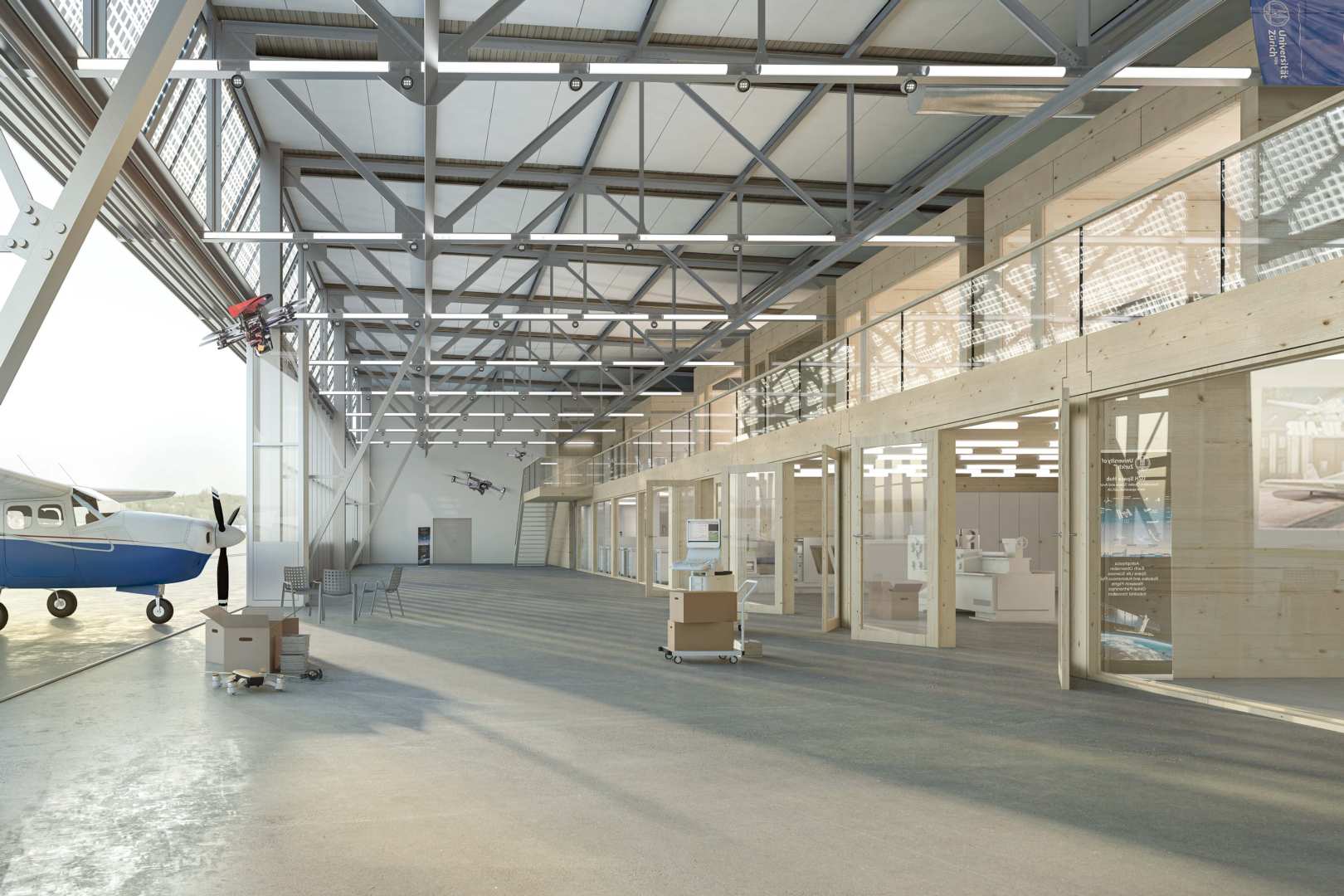 Die Halle 4 zeichnet sich durch eine Stahlwerkskontruktion mit räumlicher Grosszügigkeit und atmosphärisch industrieller Prägung aus. Der bestehende Hangar wird als ‘Mantel’ für den vorgesehenen Raumbedarf genutzt. Der Innenausbau sieht ein Haus-in-Haus System vor, dessen Berührungspunkte mit dem Bestand minimiert und weitgehend reversibel sind. Dadurch entsteht eine maximale Durchlässigkeit – der ursprüngliche Hallenraum bleibt weiterhin spür- und erlebbar. Die verschiedenen Funktionen und Nutzungen widerspiegeln sich in den einzelnen Raumschichten und Ebenen. Ein robustes Raumlayout, Nachhaltigkeit und Flexibilität tragen zur Wahrung des ursprünglichen Charakters der ehemaligen Flugzeughalle sowie zum Schaffen eines attraktiven Arbeits- und Begegnungsortes als Forschungs- und Innovationszentrum bei. Die Holzelementbauweise in Vorfabrikation bietet eine grosse Flexibilität und trägt sowohl zu einer schnellen Bauzeit als auch zu einer spezifischen, provisorischen Ausstrahlung mit nachhaltigem Charakter bei. Die Einbauten bestehen aus hellem, weitgehend unbehandeltem Fichtenholz und stehen in Dialog zum industriellen Charakter der Umhüllung. Strassenseitig wird die vorhandene Aussenfassade mit einer Wärmedämmung und einem hinterlüfteten Trapezblech ergänzt. Zum Rolllfeld hin ist eine neue Glasfassade als Pfosten-Riegel-Konstruktion mit textilem Sonnenschutz und darüber liegender Oblichtverglasung mit PV-Modulen vorgesehen. Die Ausbildung der Hülle nimmt Referenz auf den industriellen Charakter des Hangars und stärkt die Wirkung des vorhandenen Ensembles.